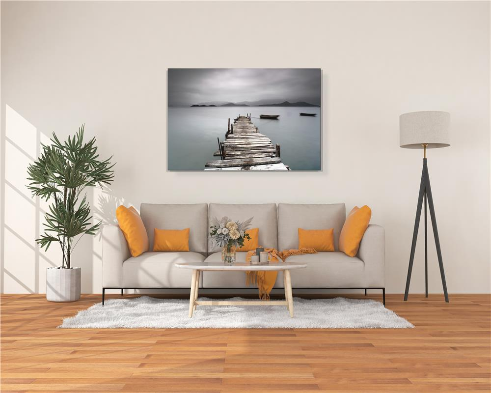 Eski İskele Bu kanvas tablo, gölün dingin yüzeyine uzanan eski bir ahşap iskelenin nostaljik ve huzur verici atmosferini yansıtıyor. Ufka doğru uzanan iskele, izleyene geçmişle bugün arasında bir yolculuk hissi verirken; sakin göl suları ve puslu dağ manzarası tabloya derinlik katıyor. Hafifçe süzülen kayıklar ise tabloya hareket ve romantik bir dokunuş ekliyor. “Eski İskele”, yaşam alanlarınıza dinginlik, huzur ve melankolik bir zarafet katarken, aynı zamanda güçlü bir odak noktası oluşturur. Old Pier This canvas artwork reflects the nostalgic and serene atmosphere of an old wooden pier stretching over the calm surface of a lake. Leading the eye toward the horizon, the pier evokes a sense of journey between past and present, while the misty mountains in the background add depth and mystery. The gently drifting boats bring a touch of movement and romance to the tranquil scene. “Old Pier” adds peace, tranquility, and a touch of poetic elegance to any space, serving as a powerful focal point in your decor.